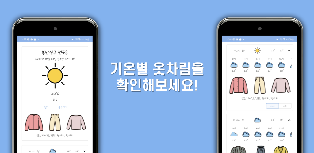 최고 기온과 최저 기온에 대한 옷차림을 확인할 수 있다.기술 소개