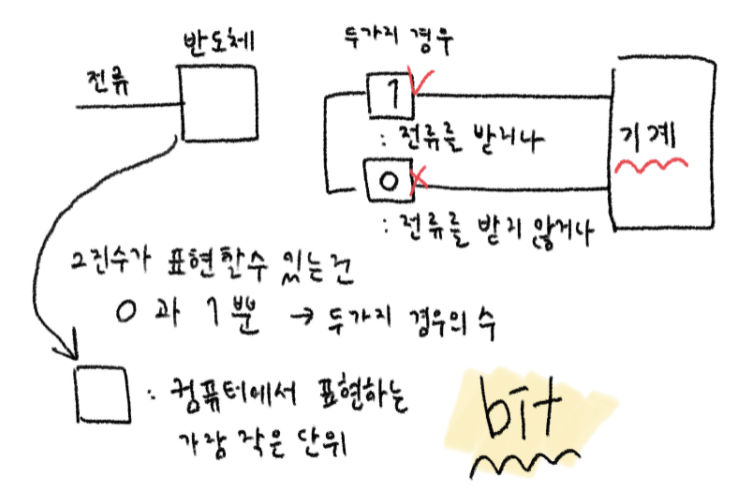 0: 흐르지 않거나2진수가 표현할 수 있는 건 오직 0과 1 두가지 뿐!