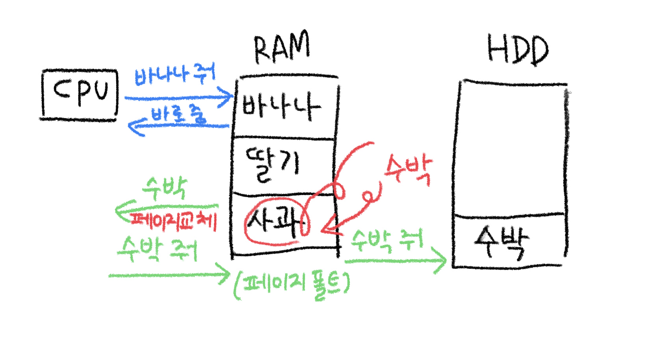 (* 페이지(page) : 가상 메모리를 일정한 크기로 나눈 블록) - 따라서 CPU가 수박을 요청했을 경우 (페이지 폴트)